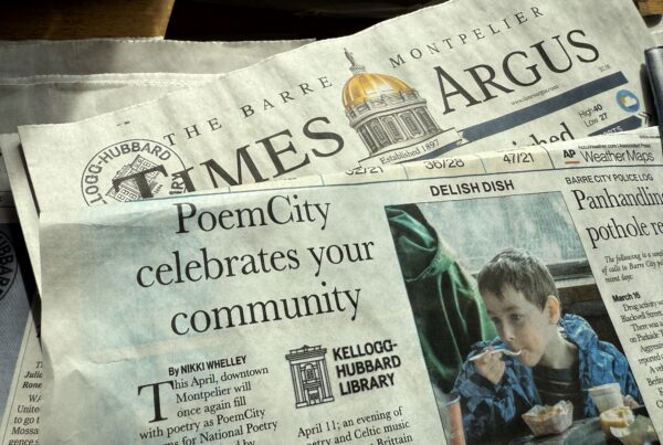 PoemCity is our annual celebration of National Poetry Month each April. PoemCity displays poems by Vermonters in storefront windows in downtown Montpelier and organizes a community calendar of poetry events for the month.